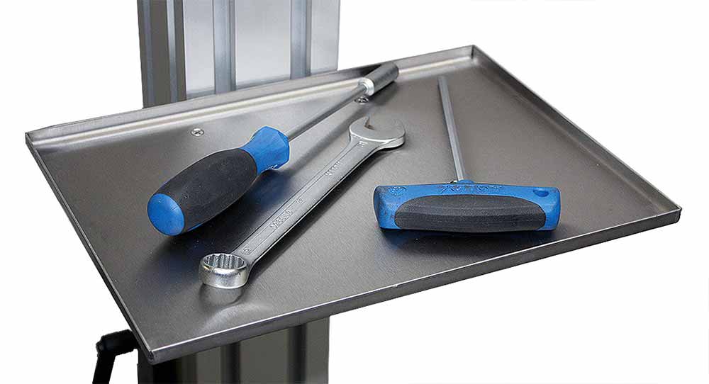 Ablageschale für Kleinteile und Werkzeug. Sie wird am Gleitschuh befestigt und ist somit immer auf Arbeitshöhe.