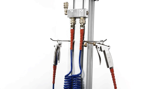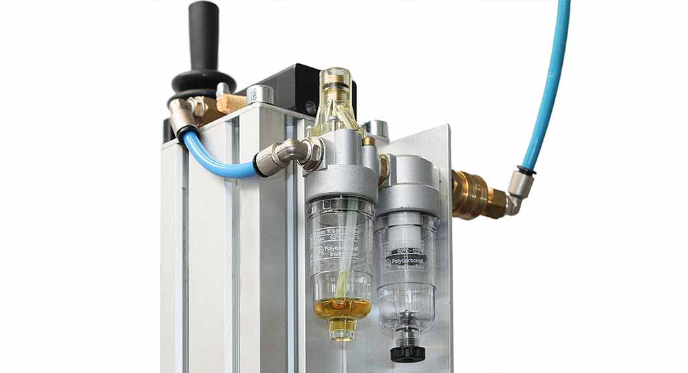 Die Wartungseinheit besteht aus Öler und Wasserabscheider. Sie ist mit Haltewinkel und Schlauchanschlüssen ausgestattet.