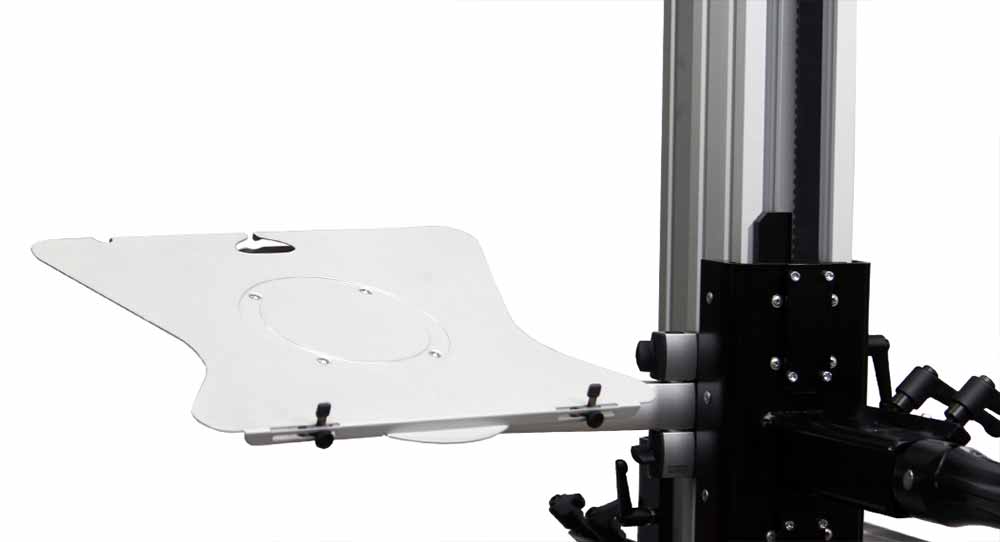 Dreh- und schwenkbare Notebookablage mit einer Auflagefläche von 404 x 288 mm für normale und große Notebooks. Die Auflageplatte ist mit einer Kabeldurchführung versehen