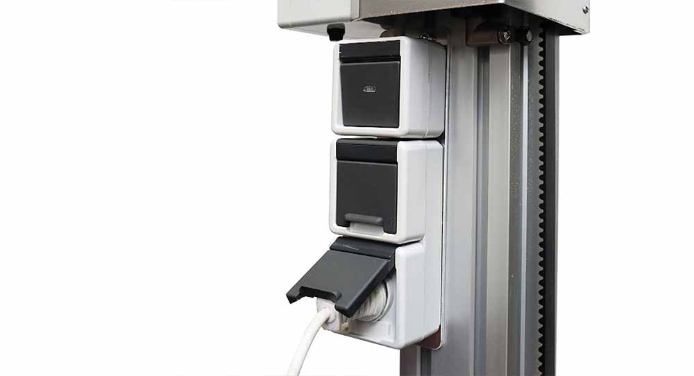 Die Doppelsteckdose ist am Montageständer befestigt. Die obere Steckdose kann mittels Schalter deaktiviert werden.
